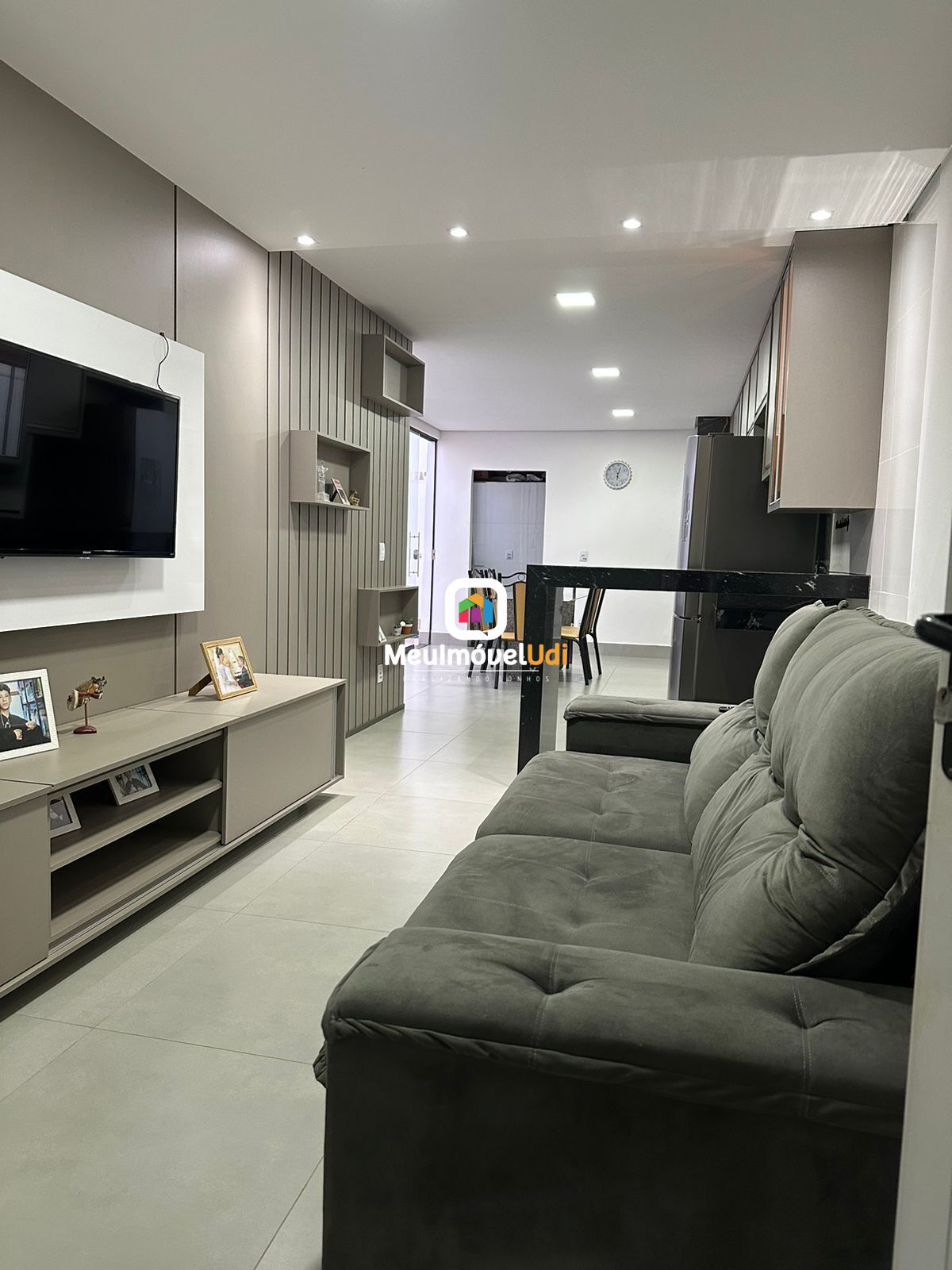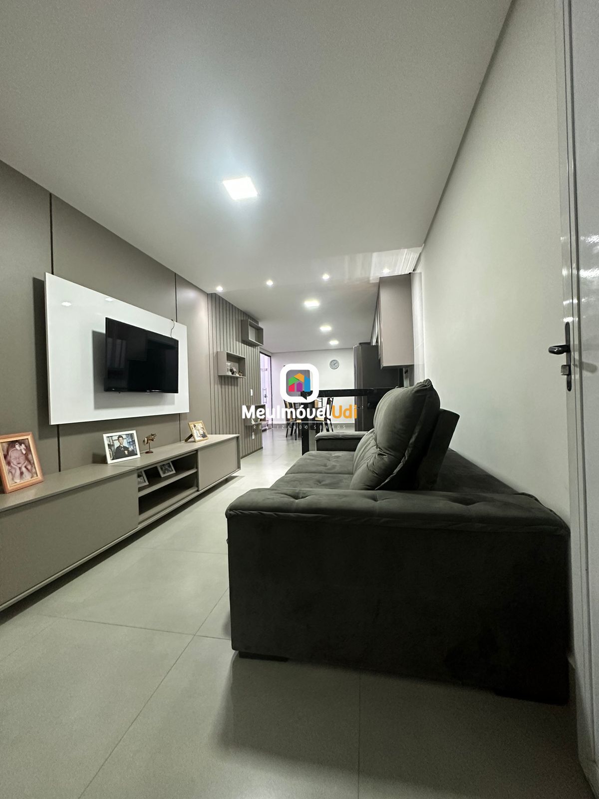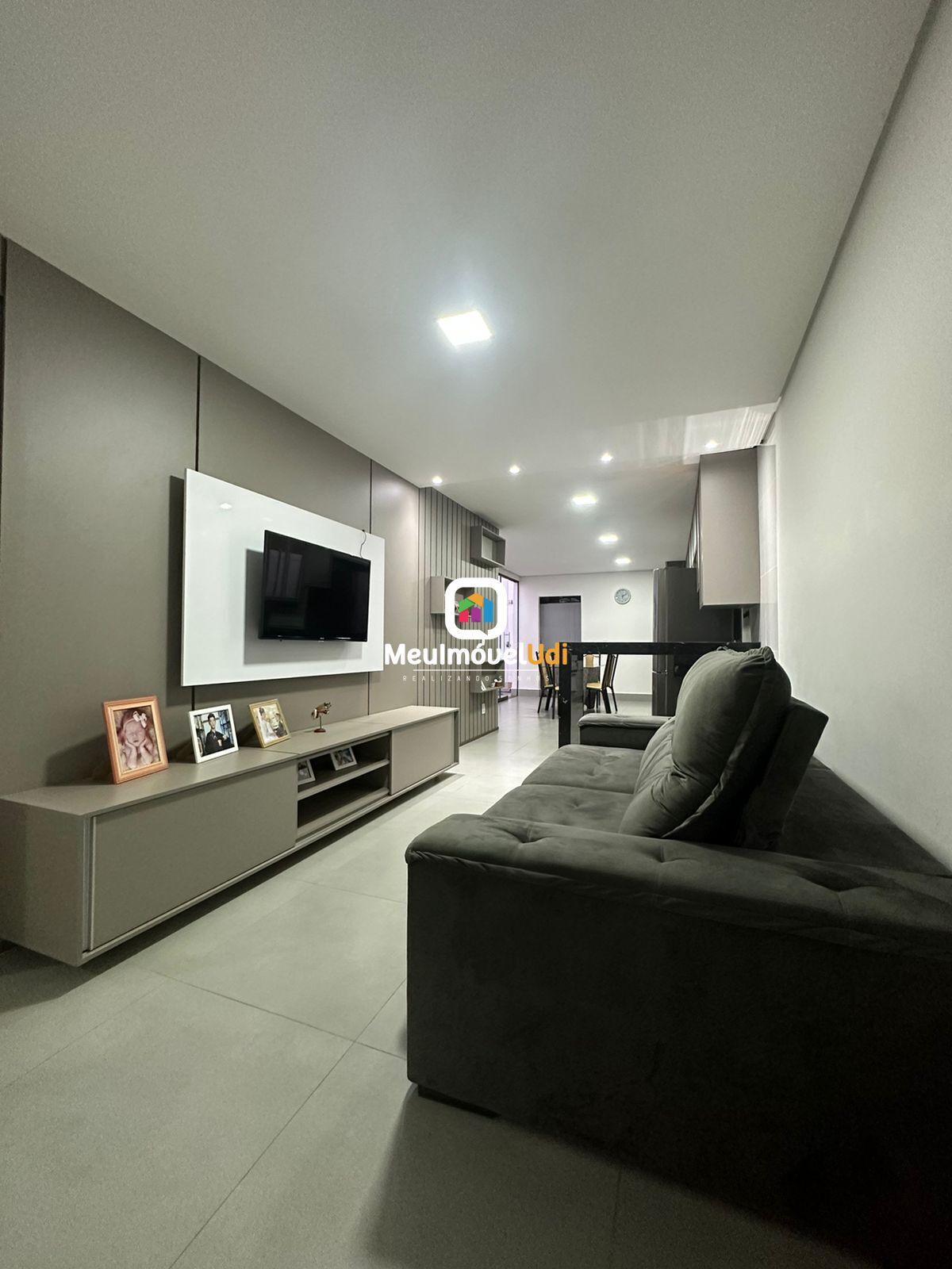Sala ampla com painel de TV;