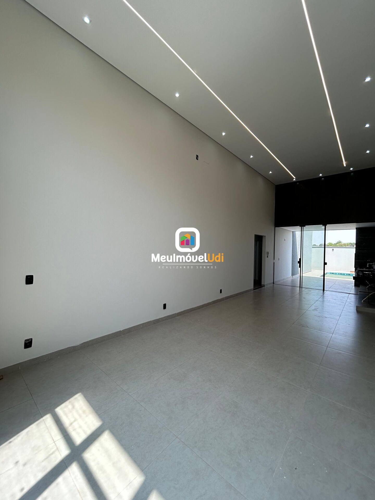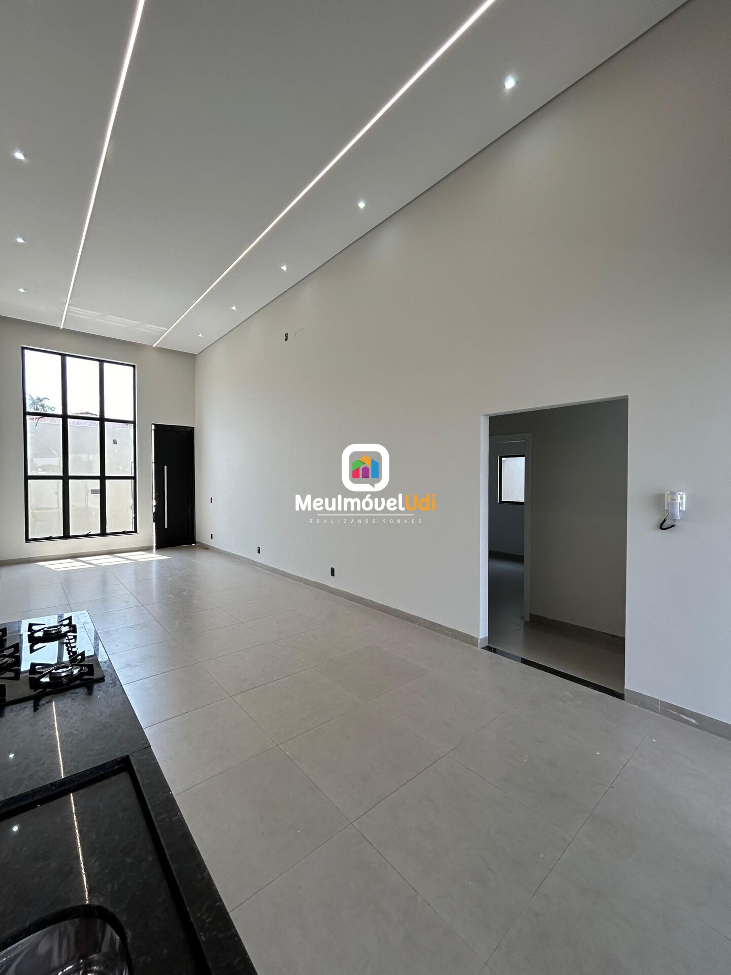 Sala em dois ambientes com pé direito duplo;