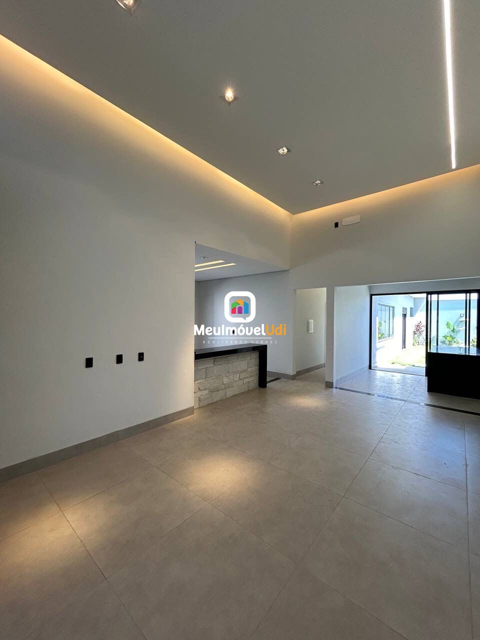 Sala ampla em dois ambientes com pé direito duplo;