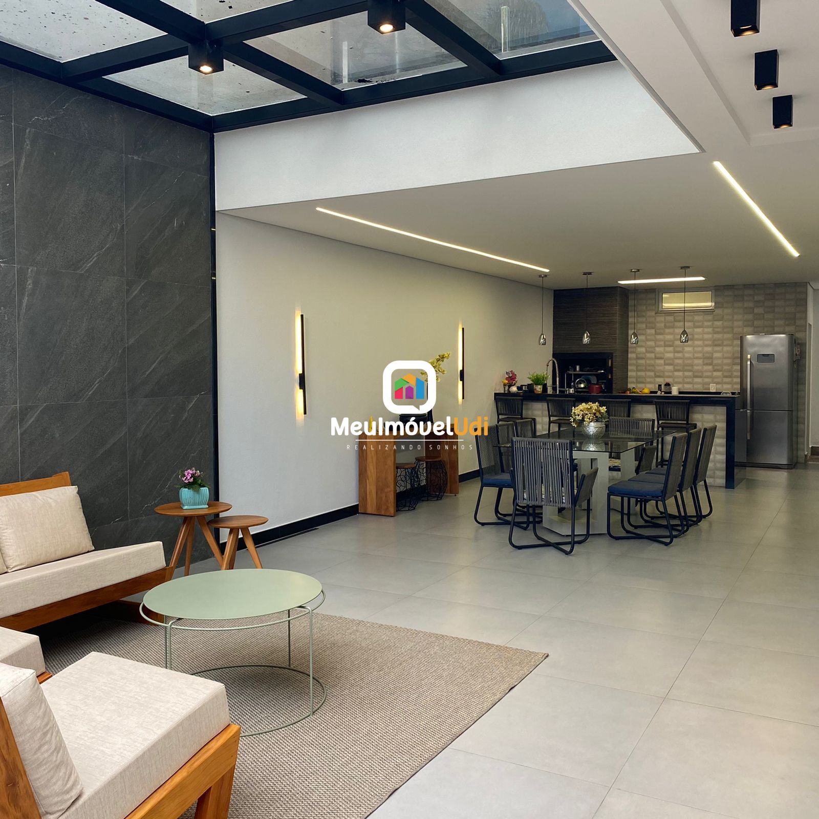 Sala ampla em dois ambientes com pé direito alto;