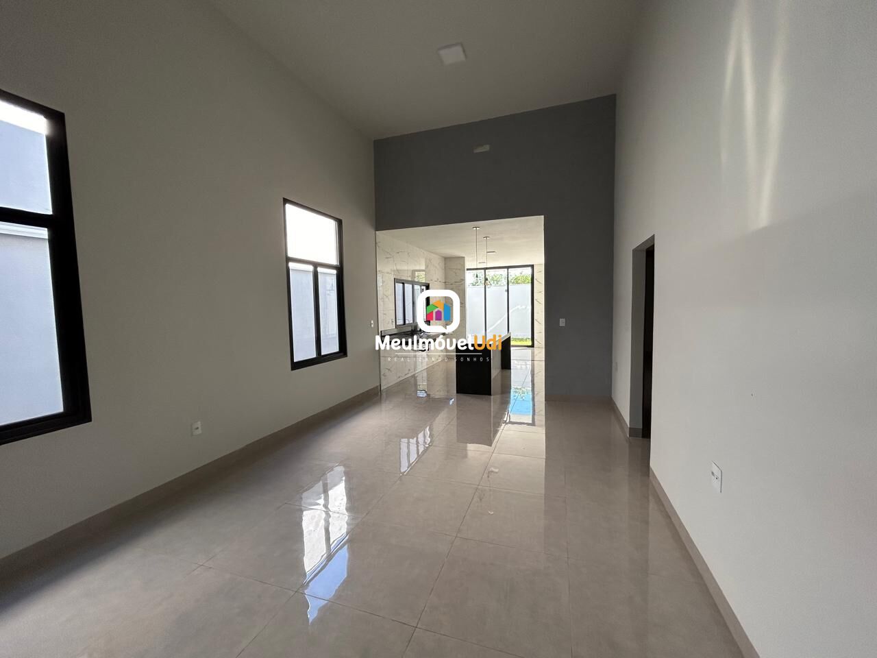 Sala ampla em dois ambientes com pé direito alto;