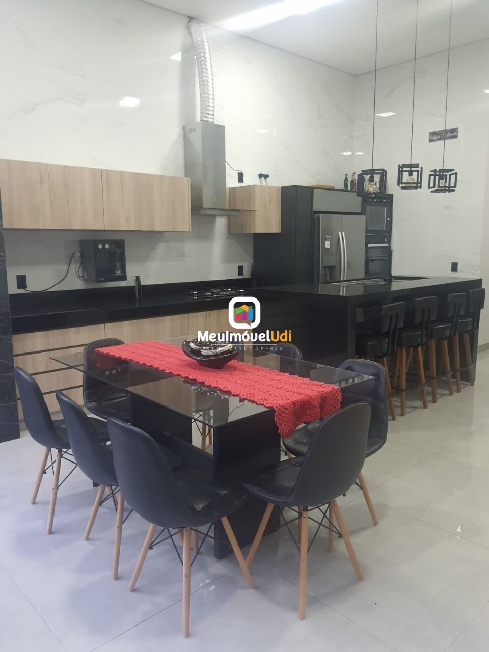 Cozinha gourmet com churrasqueira e bancada em ilha;