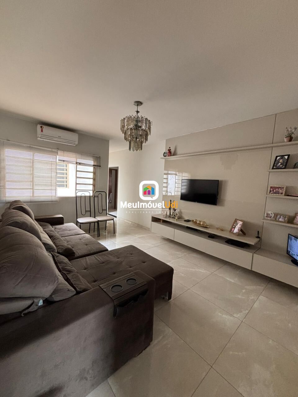 Sala de TV com painel e ar-condicionado;