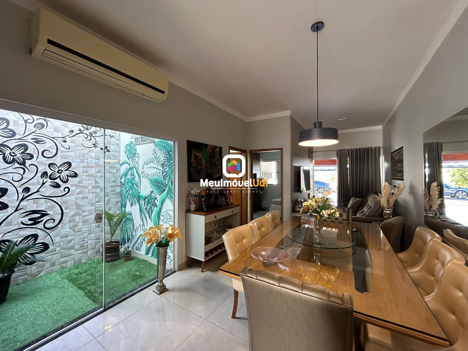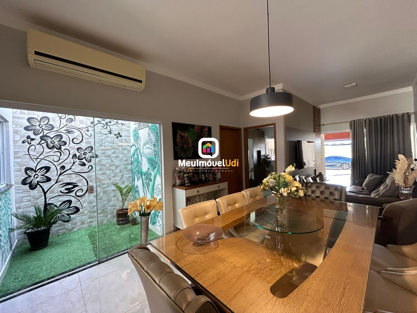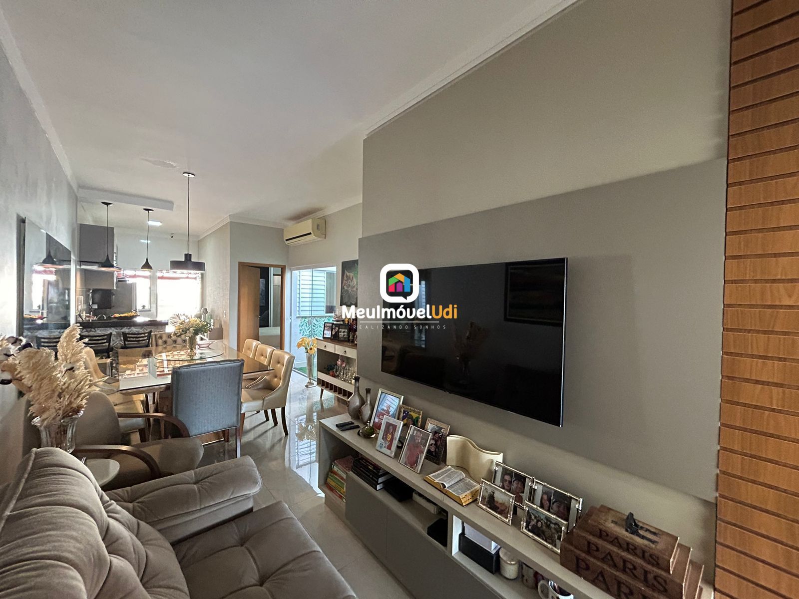 Sala ampla em dois ambientes com painel embutido;